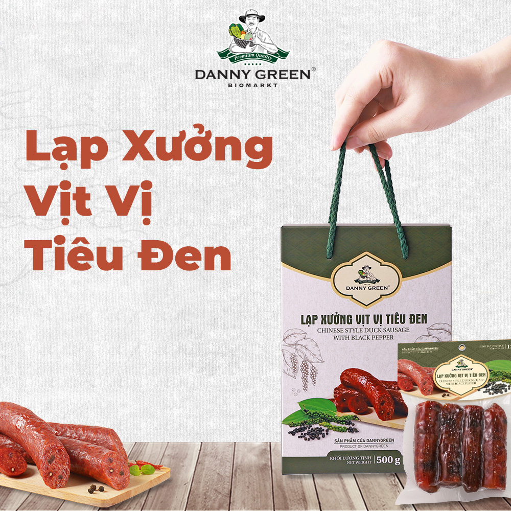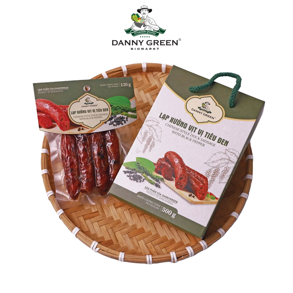 – Mô tả: Lạp Xưởng Vịt Vị Tiêu Đen DannyGreen khi ăn có một độ xốp mềm nhất định từ thịt vịt, vị ngọt nhẹ hòa lẫn vị đậm đà của các loại gia vị được nghiên cứu kết hợp theo công thức đặc biệt.